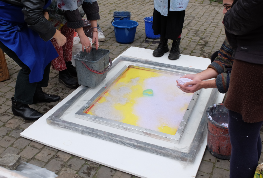 Un temps de partage a permis de revenir sur ce qui a été mis en œuvre par Cécile Barraud de Lagerie pendant le workshop et de rendre compte du travail collectif, par Manon Badillo-Collart, étudiante SITU. Ensuite, le groupe formé d’étudiant·e·s et enseignant·e·s est également allé sur la place du Jeu de Balle pour expérimenter le relevé de couleurs in-situ.